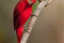血雀雀科朱雀属鸟类,体重36-49克;体长155-182毫米。雄鸟除眼先、翼与尾为黑色外,通体为鲜红色;嘴鲜黄;雌鸟暗橄榄绿色,羽端较淡或带黄色;腰鲜黄;嘴较暗。虹膜褐色;嘴黄色;腿和脚褐色。…全部>>