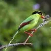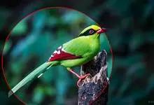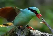 蓝绿鹊:中型鸟类,共有5个亚种。体长36-38厘米。尾长,嘴、脚红色。通体羽色主要为草绿色,宽阔的黑色贯眼纹向后延伸到后颈,在绿色的头侧极为醒目。两翅栗红色,内侧飞羽具黑色次端斑和白色尖端。尾绿色,…全部>>