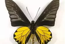 金裳凤蝶是凤蝶科、裳凤蝶属的动物。金裳凤蝶身体呈黑色,头、颈和胸侧有红毛,腹部有黑黄两色相间条纹,雄蝶前翅黑色,具黑天鹅绒光泽,各脉两侧灰白色,后翅金黄色,各室外缘有等腰三角形黑斑1枚,斑内侧有晕,…全部>>