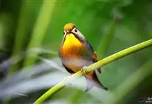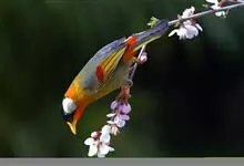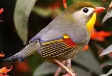 银耳相思鸟小型鸟类,体长14~18厘米。头顶黑色,耳羽银灰色,前额橙黄色;外侧飞羽橙黄色,基部朱红色,极为鲜艳、醒目。尾圆形,尾上、尾下覆羽朱红色,尾暗灰褐色,外侧尾羽橙黄色,其余上体橄榄绿或橄榄黄色。…全部>>