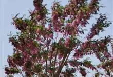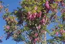 红花刺槐是豆科刺槐属的植物。其干皮深纵裂;枝具托叶刺,羽状复叶互生,叶片卵形或长圆形,具芒尖;基部圆形。花两性;总花序下垂;花冠粉红色,芳香;果条状长圆形,腹缝有窄翅。花期4~5月,果期9~10月。…全部>>