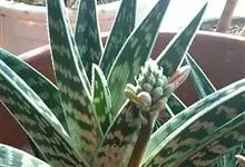 翠花掌是百合科、芦荟属植物。多年生肉质植物。株高20~30厘米具短茎,叶片三角剑形,肥厚多肉。表面下凹呈“V”形。叶长约12厘米,宽3-5厘米,有横向排列不规则的银白色或灰白色斑纹。松散的总状花序,…全部>>