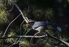 红嘴蓝鹊,别名山鹊、长尾鹊,是鸦科蓝鹊属的一种观赏性较强的大型鸣禽。该物种为体长54~65cm,头、颈、喉和胸黑色,头顶至后颈有一块白色至淡蓝白色或紫灰色块斑,其余上体紫蓝灰色或淡蓝灰褐色。尾长呈凸状,…全部>>
