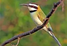 黄喉蜂虎属中型鸟类,体长23-30厘米。喉黄色,其下有一窄的黑色胸带;胸带以下的整个下体蓝绿色。前额蓝白色,具一宽的黑色贯眼纹,头顶至后颈暗栗色,尾蓝绿色,中央尾羽延长,明显突出于其他尾羽。…全部>>
