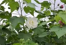 木芙蓉,锦葵科木槿属落叶灌木或小乔木。小枝上有细绒毛;叶片为卵状心形,托叶为披针形,常早落;花单生,花萼为钟形,花冠初为白色或淡红色,后逐渐变为深红色;果实为扁球形,有淡黄色的毛附着。花期8到10月。…全部>>