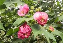 木芙蓉,锦葵科木槿属落叶灌木或小乔木。小枝上有细绒毛;叶片为卵状心形,托叶为披针形,常早落;花单生,花萼为钟形,花冠初为白色或淡红色,后逐渐变为深红色;果实为扁球形,有淡黄色的毛附着。花期8到10月。…全部>>
