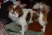 日本狆是极小型犬;被毛长而丰厚,不弯曲;毛色为白色底,带黑色或栗色斑块,斑块颜色越艳越好;斑块以在耳、身、面、尾根左右对称者为佳;头较大而圆,头骨平坦;吻短,鼻尖缩至两眼之间,几乎与眼同齐;眼大而凸出,…全部>>