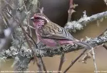 喜马拉雅白眉朱雀:小型鸟类,体长15-17厘米,体重24-35克。额基、眼先深红色,前额和一条长而宽阔的眉纹珠白色沾有粉红色并具丝娟光泽,在暗色的头部极为醒目。头顶至背棕褐或红褐色、具黑褐色羽干纹,…全部>>