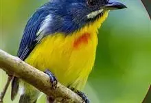黄腹啄花鸟:体重11-16克,体长104-117毫米。是一种体型大,下腹部为艳黄色的啄花鸟,雄鸟特征为头黑色,喉部有白色纵斑、喉侧及上体成对比,两翅和尾黑色,外侧尾羽内翈具白色斑块。其余下体淡黄色。…全部>>