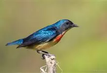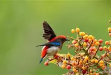 红胸啄花鸟:体重5-10克,体长60-92毫米。体形纤小。雄鸟上体呈辉亮的金属绿色;下体棕黄,胸部具一朱红色块斑,极易与其他啄花鸟区别。雌鸟上体呈橄榄绿,下体棕黄色。虹膜褐色,嘴褐黑色或角灰色,…全部>>