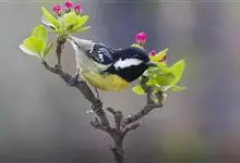 黄腹山雀是雀形目山雀科山雀属鸟类。虹膜褐色或暗褐色;嘴蓝黑色或灰蓝黑色;头、喉胸斑黑色,颊斑、颈后斑白色;上体蓝灰色,腰银白色;翼具两排白色点斑;下胸、腹鲜黄色;尾黑色,…全部>>