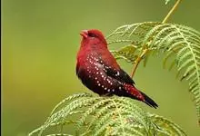 红梅花雀小型鸟类,体长9-10厘米。雄鸟通体朱红色,背、肩、胸等满布白色小斑点,两翅和尾黑褐色均具白色端斑,嘴红色,脚蜡黄色。雌鸟上体淡褐色或赭褐色,翅上中覆羽、大覆羽和内侧飞羽末端具白色斑点,…全部>>
