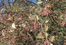 火棘 H. L. Li)是蔷薇科火棘属常绿灌木,老枝呈暗褐色;叶片呈倒卵形,边缘有钝锯齿,齿尖向内弯,两面皆无毛;叶柄短,无毛或嫩时有柔毛;花序是复伞房状,花瓣呈白色近圆形;果球近圆形,…全部>>