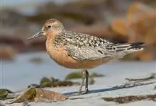 红腹滨鹬,是鹬科、滨鹬属的小型涉禽,体长23-25厘米,嘴较短而直、黑色,脚亦甚短、绿色。体较粗胖。夏季上体灰褐色具黑色中央纹,背具棕栗色和白色斑纹和羽缘,头侧和整个下体栗红色。冬季棕红色消失,…全部>>