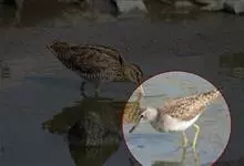 泽鹬:小型涉禽,体长19-26厘米。嘴长,相当纤细,直而尖。颜色为黑色,基部绿灰色,脚细长,暗灰绿色或黄绿色。夏季上体灰褐色具黑色斑,腰白色并向下呈楔形延伸。下体白色,颈、胸具细的黑色纵纹。…全部>>