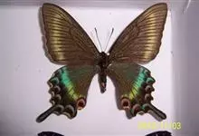 绿带翠凤蝶,又名深山凤蝶,为凤蝶科凤蝶属下的一种。分布于韩国、日本、中国台湾、中国大陆等地。翅黑色,满布金绿色鳞片。前翅亚缘具黄绿色横带纹。后翅外缘有6个略呈新月形的红斑,…全部>>