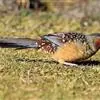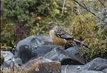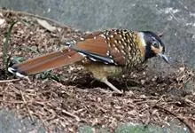大噪鹛:中型鸟类,体长32-36厘米。额至头顶黑褐色,背栗褐色满杂以白色斑点,斑点前缘或四周还围有黑色。初级覆羽、大覆羽和初级飞羽具白色端斑。尾特长,均具黑色亚端斑和白色端斑。颏、喉棕褐色,…全部>>