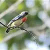 红胸啄花鸟:体重5-10克,体长60-92毫米。体形纤小。雄鸟上体呈辉亮的金属绿色;下体棕黄,胸部具一朱红色块斑,极易与其他啄花鸟区别。雌鸟上体呈橄榄绿,下体棕黄色。虹膜褐色,嘴褐黑色或角灰色,…全部>>