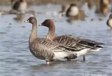 豆雁,雁形目鸭科。成鸟头、颈、背灰褐色,带淡黄色羽缘;尾上覆羽白色,尾羽黑褐色带白端,故飞行伸展时可见尾基和尾端各有一条白色弧线;翼上覆羽灰褐色,初级覆羽深黑灰色带黄白色羽缘,…全部>>