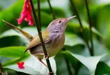 普通缝叶莺,是雀形目鹅科莺亚科缝叶莺属一种。体长10-14厘米,体重7-10克,雄鸟前额棕红,头顶至枕棕橄榄褐,上体橄榄绿染黄,飞羽及尾羽暗褐;繁殖期雄鸟的中央尾羽特形延长,下体淡皮黄白色。…全部>>