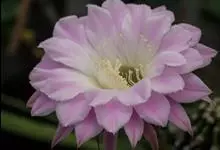 仙人球花 仙人掌科,仙人球属。植株单生或成丛。幼株球形,老株长成圆筒状,高可达75厘米,直径12-15厘米。球体暗绿色,具棱11-12。刺锥状,黑色,长1-1.5厘米。花着生于球体侧方,大型嗽喇叭状…全部>>
