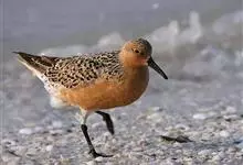 红腹滨鹬,是鹬科、滨鹬属的小型涉禽,体长23-25厘米,嘴较短而直、黑色,脚亦甚短、绿色。体较粗胖。夏季上体灰褐色具黑色中央纹,背具棕栗色和白色斑纹和羽缘,头侧和整个下体栗红色。冬季棕红色消失,…全部>>