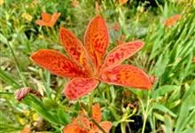 射干 Redouté)是鸢尾科射干属多年生草本植物。根状茎为不规则的块状,斜黄色或黄褐色;花橙红色,散生紫褐色的斑点;花药呈条形;子房下位,倒卵形;蒴果倒卵形或长椭圆形;种子圆球形,黑紫色,有光泽。…全部>>