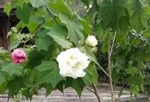 木芙蓉,锦葵科木槿属落叶灌木或小乔木。小枝上有细绒毛;叶片为卵状心形,托叶为披针形,常早落;花单生,花萼为钟形,花冠初为白色或淡红色,后逐渐变为深红色;果实为扁球形,有淡黄色的毛附着。花期8到10月。…全部>>