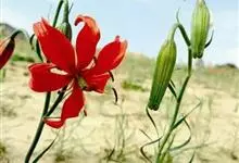 山丹是百合科百合属的多年生草本植物。鳞茎卵形或圆锥形,鳞片长圆形或长卵形,白色;叶散生茎中部,线形,边缘有乳头状突起;花单生或数朵成总状花序,花鲜红色,常无斑点,花被片反卷,…全部>>