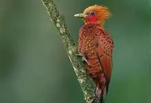 栗啄木鸟:是一种红褐色啄木鸟,体长21厘米。雄性成鸟整个头棕色,但稍淡;眼下有一宽阔血红色纵纹;翕部深棕色,背、腰、尾上覆羽、尾羽也是深棕色;除尾羽外,各羽均具黑色横斑;尾羽则具黑色点斑;翼也是深棕色,…全部>>