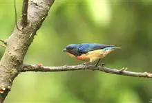 红胸啄花鸟:体重5-10克,体长60-92毫米。体形纤小。雄鸟上体呈辉亮的金属绿色;下体棕黄,胸部具一朱红色块斑,极易与其他啄花鸟区别。雌鸟上体呈橄榄绿,下体棕黄色。虹膜褐色,嘴褐黑色或角灰色,…全部>>