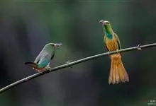 绿喉蜂虎是佛法僧目、蜂虎科的小型鸟类,共有9个亚种。身长22-25厘米,翼展29-30厘米,体重15-20克。喉绿色,额部、头顶至上背为锈红色,其余上体均为亮绿色。中央尾羽延长且端段狭细,…全部>>