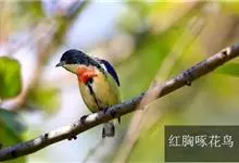 红胸啄花鸟:体重5-10克,体长60-92毫米。体形纤小。雄鸟上体呈辉亮的金属绿色;下体棕黄,胸部具一朱红色块斑,极易与其他啄花鸟区别。雌鸟上体呈橄榄绿,下体棕黄色。虹膜褐色,嘴褐黑色或角灰色,…全部>>