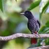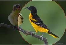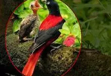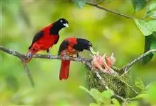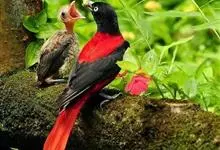 朱鹂:中等鸟类,体长23-28厘米。雄鸟绛紫红色,头、上胸及翼黑色。雌鸟上背及背部深灰色,尾覆羽及尾绛紫红色,腹部及下胸白而密布黑色纵纹。与鹊色鹂幼鸟的区别在上背灰色较深,下体白色较少且纵纹较粗。…全部>>