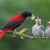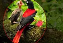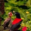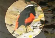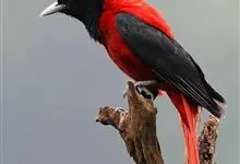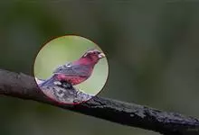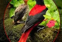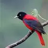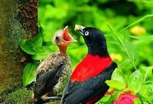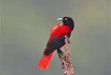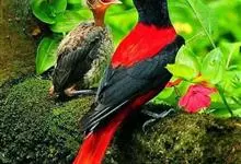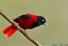 朱鹂:中等鸟类,体长23-28厘米。雄鸟绛紫红色,头、上胸及翼黑色。雌鸟上背及背部深灰色,尾覆羽及尾绛紫红色,腹部及下胸白而密布黑色纵纹。与鹊色鹂幼鸟的区别在上背灰色较深,下体白色较少且纵纹较粗。…全部>>