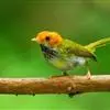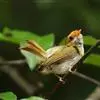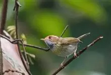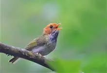 棕脸鹟莺:体长10厘米,是一种色彩亮丽而有特色的莺鸟。头栗色,具黑色侧冠纹。上体绿,腰黄色。下体白,颏及喉杂黑色点斑,上胸沾黄。与栗头鹟莺的区别在头侧栗色,白色眼圈不显著且无翼斑。…全部>>