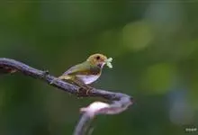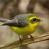 黑脸鹟莺:体长10厘米,是有特色的体小而多彩的莺鸟。粗眉纹,颏、喉及尾下覆羽黄色,脸罩黑,头顶及颈背灰色,上体绿,无翼纹,腹白。虹膜褐色;上嘴色深,下嘴肉色;脚偏绿色。…全部>>