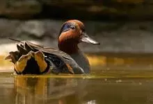 绿翅鸭是小型鸭类,体长37厘米,体重约0.5千克。嘴脚均为黑色。雄鸟头至颈部深栗色,头顶两侧从眼开始有一条宽阔的绿色带斑一直延伸至颈侧,尾下覆羽黑色,两侧各有一黄色三角形斑,在水中游泳时,极为醒目。…全部>>