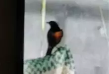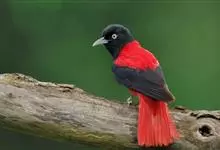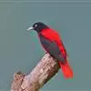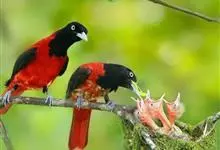 朱鹂:中等鸟类,体长23-28厘米。雄鸟绛紫红色,头、上胸及翼黑色。雌鸟上背及背部深灰色,尾覆羽及尾绛紫红色,腹部及下胸白而密布黑色纵纹。与鹊色鹂幼鸟的区别在上背灰色较深,下体白色较少且纵纹较粗。…全部>>