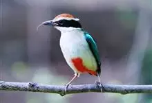 绿胸八色鸫:是雀形目八色鸫科的鸟类,共有12个亚种。体长为16-18厘米,体重65-69克。体型圆胖,尾短,腿长。头黑,上体绿色,两翼深色而具白色斑纹,头顶至后枕深褐,胸及腹部苹果绿,臀亮红。…全部>>