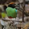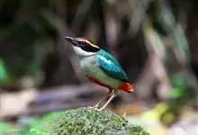 绿胸八色鸫:是雀形目八色鸫科的鸟类,共有12个亚种。体长为16-18厘米,体重65-69克。体型圆胖,尾短,腿长。头黑,上体绿色,两翼深色而具白色斑纹,头顶至后枕深褐,胸及腹部苹果绿,臀亮红。…全部>>