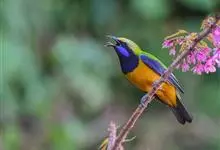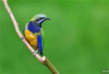 橙腹叶鹎体形大小和金额叶鹎相似,体长16~20厘米。额至后颈黄绿色,其余上体绿色,小覆羽亮钴蓝色,形成明显的肩斑。颏、喉、上胸黑色具钴蓝色髭纹,其余下体橙色。飞羽和尾羽雄鸟黑色、雌鸟绿色。…全部>>
