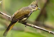 凤头雀嘴鹎:属小型鸟类,体长18-22厘米。嘴粗短、呈象牙色或乳黄色,前额和脸灰色,头顶黑色,有一朝前竖立的黑色羽冠。上体橄榄绿色,下体黄绿色,尾羽黄绿色具宽阔的黑褐色端斑。…全部>>