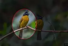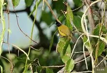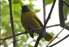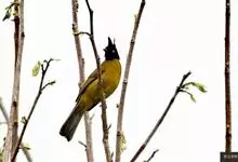 黑冠黄鹎:体长18-21厘米,是一种中等体型偏黄色鹎。整个头、颈、颏、喉黑色,头顶有显著直立的羽冠,黑色,上体褐橄榄黄绿色,下体橄榄黄色。虹膜偏红;嘴及脚黑色。…全部>>