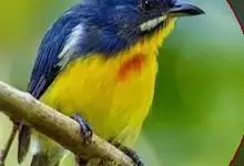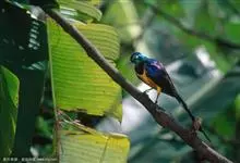 黄腹啄花鸟:体重11-16克,体长104-117毫米。是一种体型大,下腹部为艳黄色的啄花鸟,雄鸟特征为头黑色,喉部有白色纵斑、喉侧及上体成对比,两翅和尾黑色,外侧尾羽内翈具白色斑块。其余下体淡黄色。…全部>>