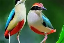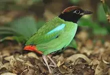 绿胸八色鸫:是雀形目八色鸫科的鸟类,共有12个亚种。体长为16-18厘米,体重65-69克。体型圆胖,尾短,腿长。头黑,上体绿色,两翼深色而具白色斑纹,头顶至后枕深褐,胸及腹部苹果绿,臀亮红。…全部>>