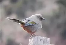 橙翅噪鹛:是噪鹛科、彩翼噪鹛属的中型鸟类,体长22-25厘米。头顶深葡萄灰色或沙褐色。上体灰橄榄褐色,外侧飞羽外翈蓝灰色、基部橙黄色,中央尾羽灰褐色,外侧尾羽外翈绿色而缘以橙黄色并具白色端斑。…全部>>