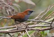 栗头地莺:小型鸣禽。体长约10厘米。体型纤细,是中国体型最小的鸟类之一;喙细尖,上喙先端多有缺刻;翅短圆;尾短至中等;腿短而细。羽色以灰、褐及橄榄绿为主,雌雄羽色相似。栖息于灌木或稀疏林内,…全部>>