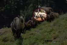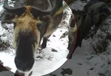 羚牛,偶蹄目牛科羚牛属哺乳动物,俗称扭角羚、野山牛、盘羊。其体形粗壮。尾短。吻鼻部隆起且裸露。前额隆起,毛短而蓬松。角基粗,由头顶长出后先向上升起,又突然翻转,靠近头部,复向外伸,然后又向后弯转,…全部>>