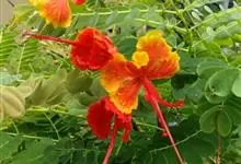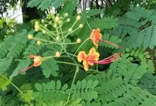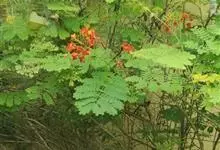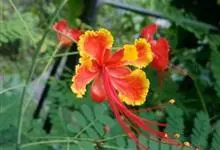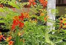 洋金凤 Sw.),豆科小凤花属灌木状或小乔木植物,枝无毛,绿或粉绿色;二回羽状复叶;总状花序伞房状,萼片无毛,花瓣橙红或黄色,圆形,花丝红色,子房无毛,花柱橙黄色;荚果窄而薄,…全部>>